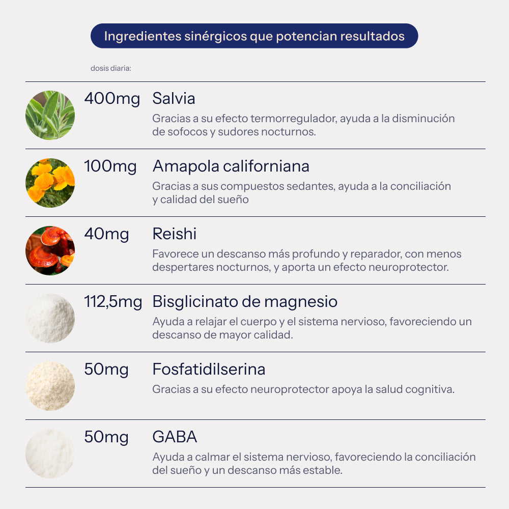 DESCANSO sincroniza tu ciclo natural del sueño, ayuda a reducir los sofocos nocturnos y protege tu mente para mantenerla ágil y activa. Domina los sudores nocturnos, promueve un descanso profundo, mejorando la calidad del sueño y protegiendo tu salud cognitiva.